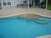 This pool has a raised deck area which has a florida fall built into it. The raised area has stack stone with waterline tile around rest of pool. This raised section makes for a nice area to sit and watch swimming from above.